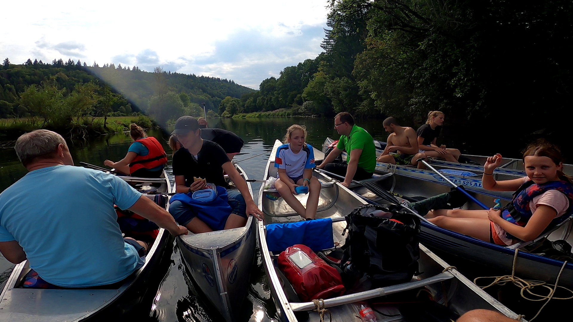 Am Freitag stand eine 20 Kilometer lange Paddeltour auf der Donau auf dem Programm. Nach anfänglichen Startschwierigkeiten konnten wir mit sechs doppelt bis dreifach belegten Kanadiern richtig loslegen. Die Mittagspause verbrachten wir gemeinsam auf dem Wasser, indem wir alle Boote zusammenbanden. Um nach der Pause wieder in Schwung zu kommen, übernahm die Jüngste im Bunde zur Freude aller Beteiligten die Motivationsrede, indem sie uns die ganze Zeit „paddeln, paddeln, paddeln, paddeln, paddeln, paddeln…“ zu rief. Obwohl die meisten mindestens einmal aus verschiedenen Gründen (unter anderem weil das ein oder andere Paddel verloren ging) ins Wasser mussten, bekamen wir zum Schluss noch eine Dusche von oben. Abends gab es zur Stärkung in Sigmaringen noch Pizza.